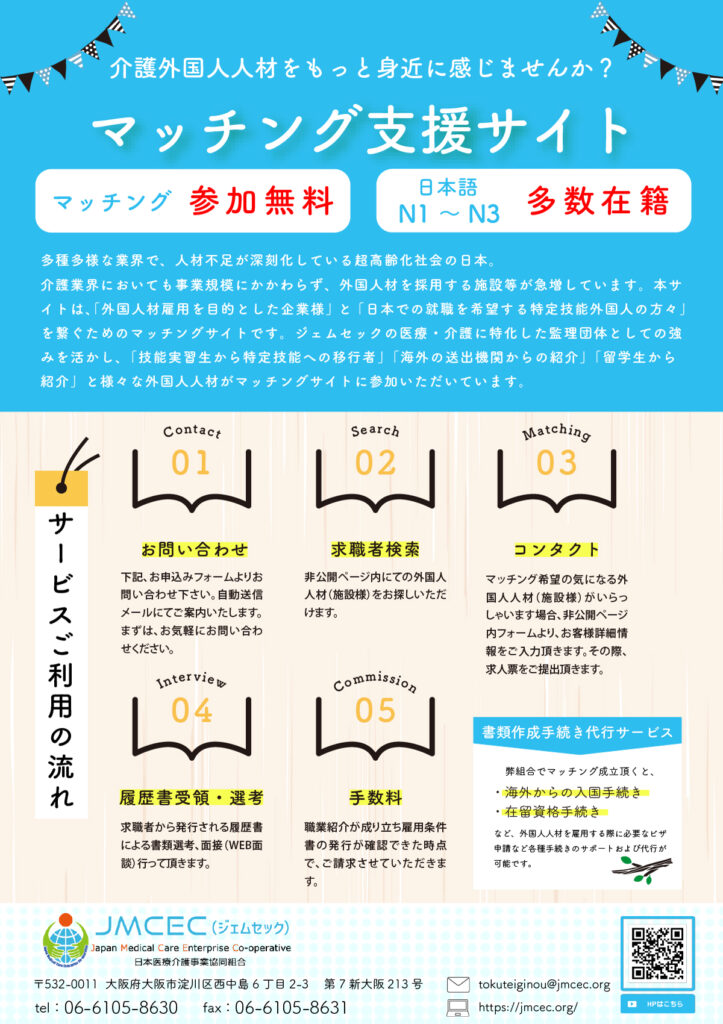 介護分野における特定技能外国人の円滑な受入れを促進し、特定技能として就労を希望する外国人と特定技能外国人の雇用を希望する受入れ企業の双方を支援するためのマッチングサービスとなります。